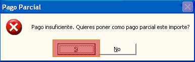 El sistema detecta que el pago no es suficiente y pregunta si se quiere aplicar como pago parcial